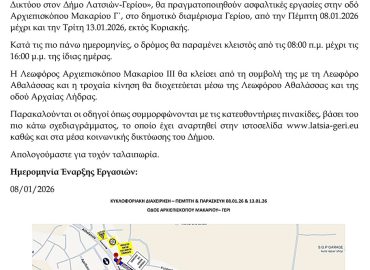 05/01/2026 ΑΝΑΚΟΙΝΩΣΗ ΚΛΕΙΣΙΜΟ ΔΡΟΜΟΥ ΑΠΟ ΤΕΤΑΡΤΗ, 7 ΙΑΝΟΥΑΡΙΟΥ 2026, ΩΡΑ 07:00 ΜΕΧΡΙ ΔΕΥΤΕΡΑ, 2 ΦΕΒΡΟΥΑΡΙΟΥ, ΩΡΑ 16:00…