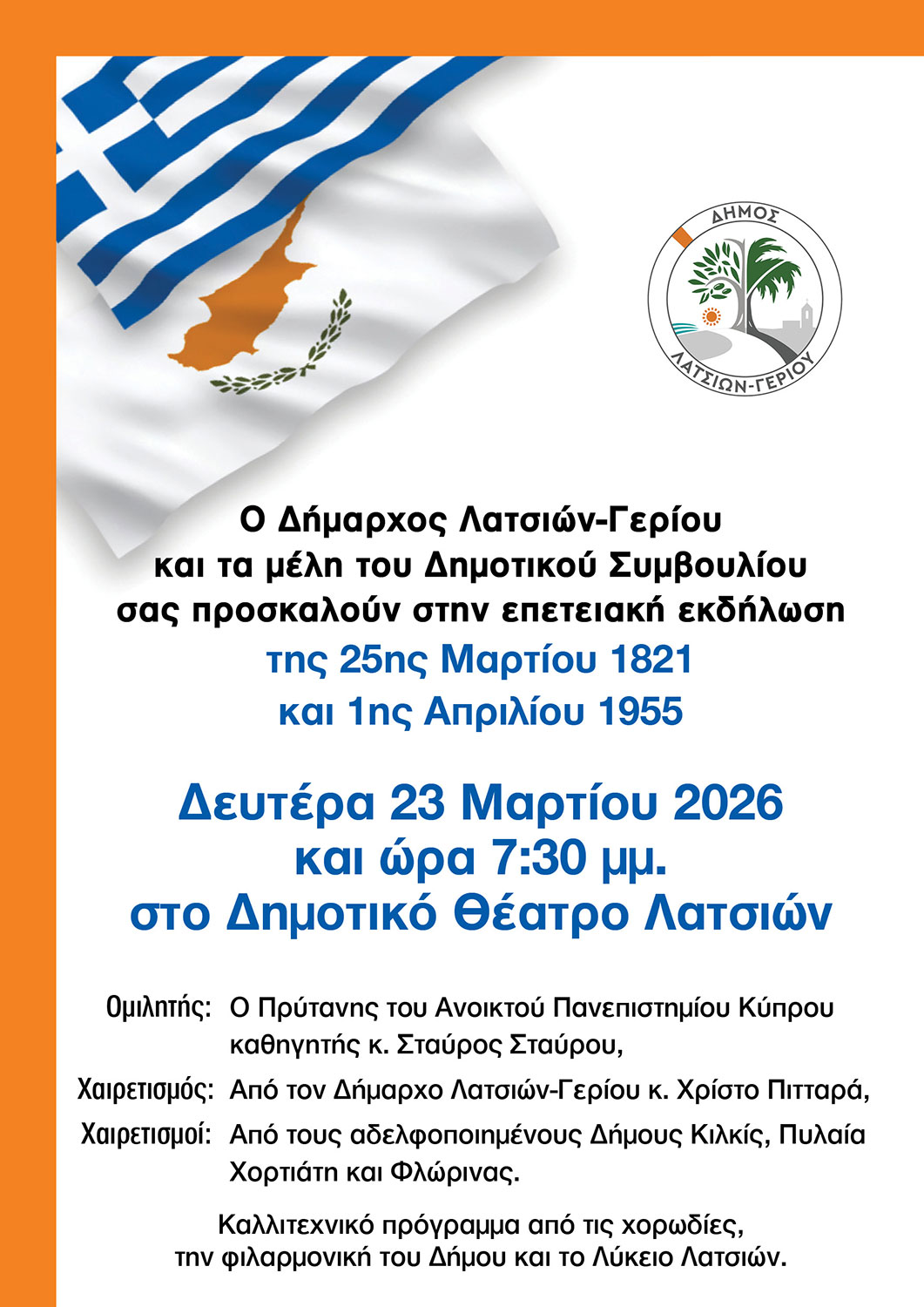 Εκδήλωση για τις Επετείους της 25ης Μαρτίου 1821 και της 1ης Απριλίου 1955, 23-3-2026, 7:30μμ