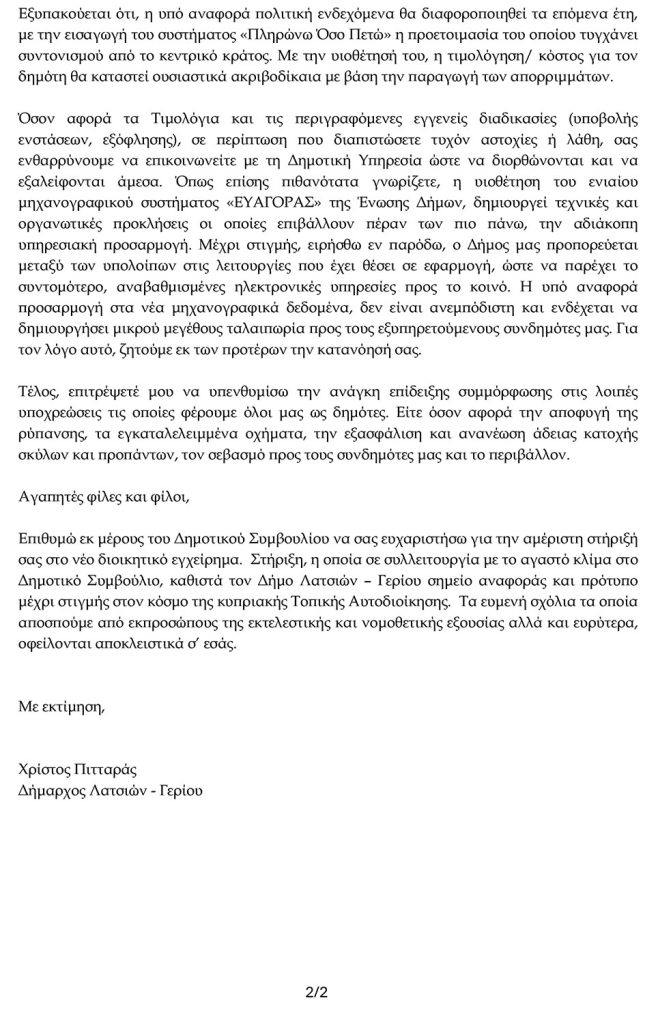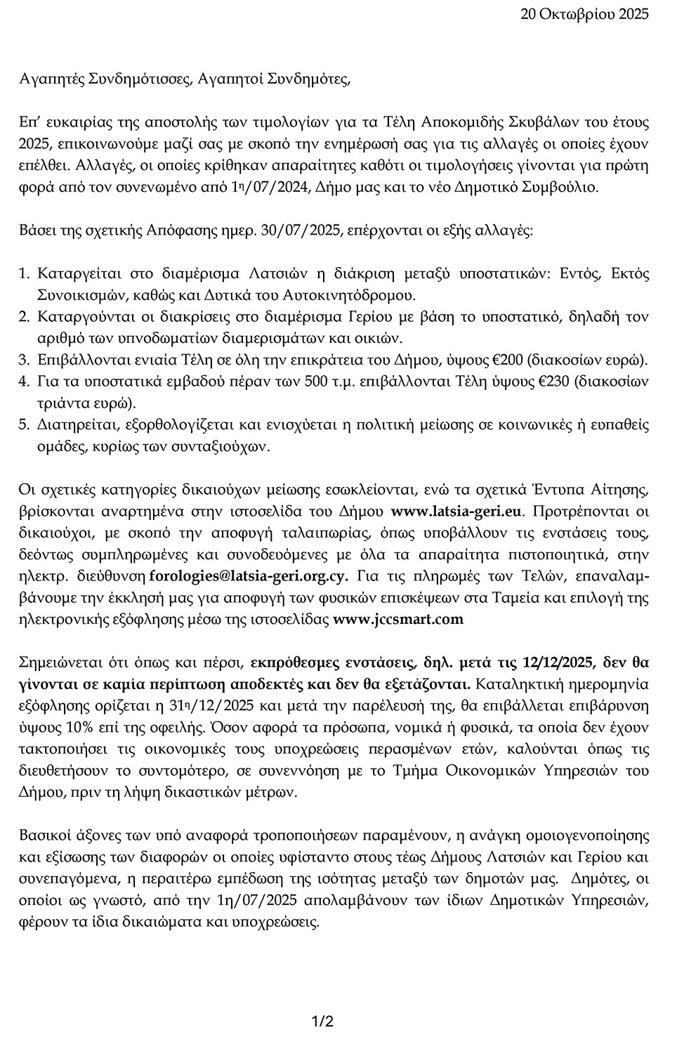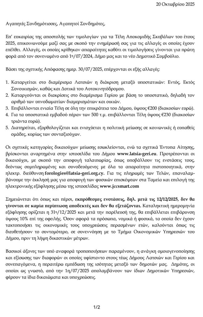 Τέλη αποκομιδής σκυβάλων 2025 - Γενικές πληροφορίες - Δήμος Λατσιών - Γερίου