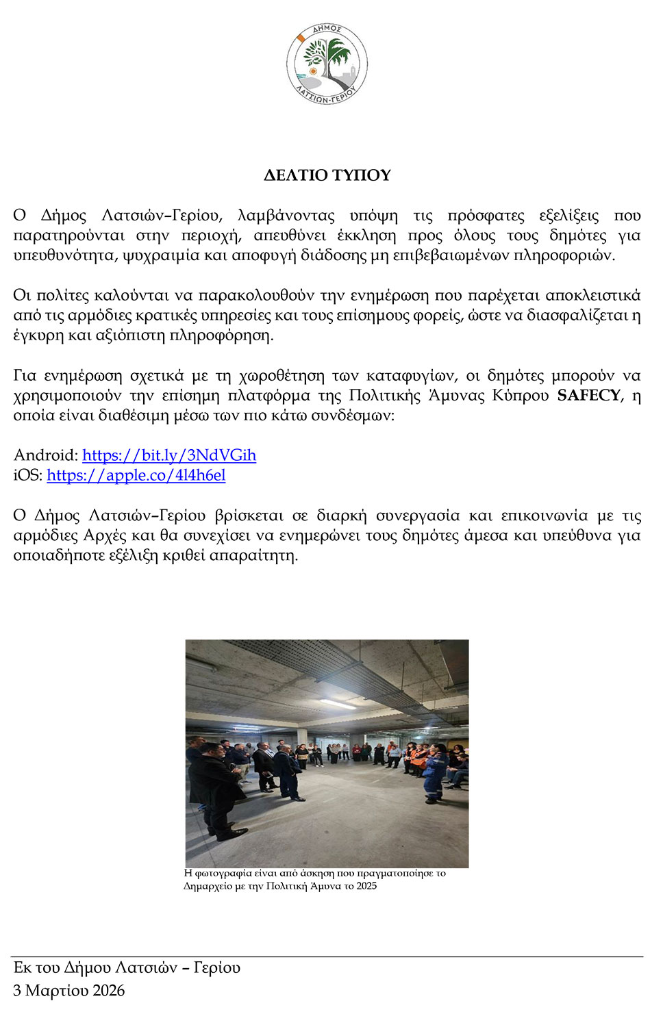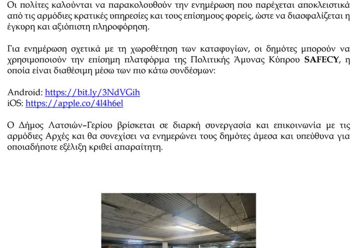 Δελτίο Τύπου: Εφαρμογή Πολιτικής Άμυνας για Καταφύγια - Δήμος Λατσιών - Γερίου
