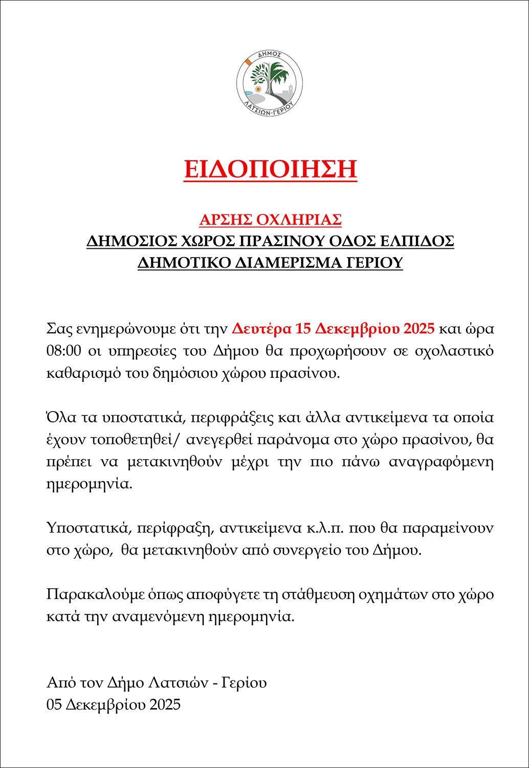 ΕΙΔΟΠΟΙΗΣΗ ΑΡΣΗΣ ΟΧΛΗΡΙΑΣ ΔΗΜΟΣΙΟΣ ΧΩΡΟΣ ΠΡΑΣΙΝΟΥ ΟΔΟΣ ΕΛΠΙΔΟΣ ΔΗΜΟΤΙΚΟ ΔΙΑΜΕΡΙΣΜΑ ΓΕΡΙΟΥ