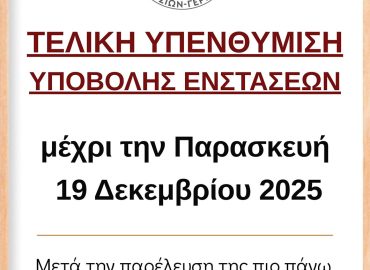 ΑΝΑΚΟΙΝΩΣΗ ΠΑΡΑΤΑΣΗ ΥΠΟΒΟΛΗΣ ΕΝΣΤΑΣΕΩΝ ΓΙΑ ΤΑ ΟΙΚΙΑΚΑ ΤΕΛΗ ΣΚΥΒΑΛΩΝ 2025 --------------------------------------------------------------------- Ο Δήμος Λατσιών – Γερίου ενημερώνει…