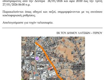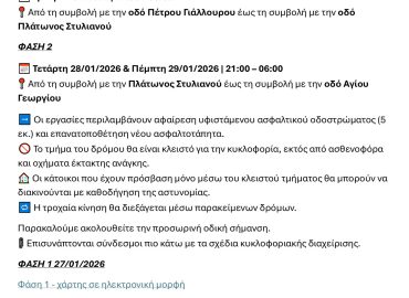 05/01/2026 ΑΝΑΚΟΙΝΩΣΗ ΚΛΕΙΣΙΜΟ ΔΡΟΜΟΥ ΑΠΟ ΤΕΤΑΡΤΗ, 7 ΙΑΝΟΥΑΡΙΟΥ 2026, ΩΡΑ 07:00 ΜΕΧΡΙ ΔΕΥΤΕΡΑ, 2 ΦΕΒΡΟΥΑΡΙΟΥ, ΩΡΑ 16:00…