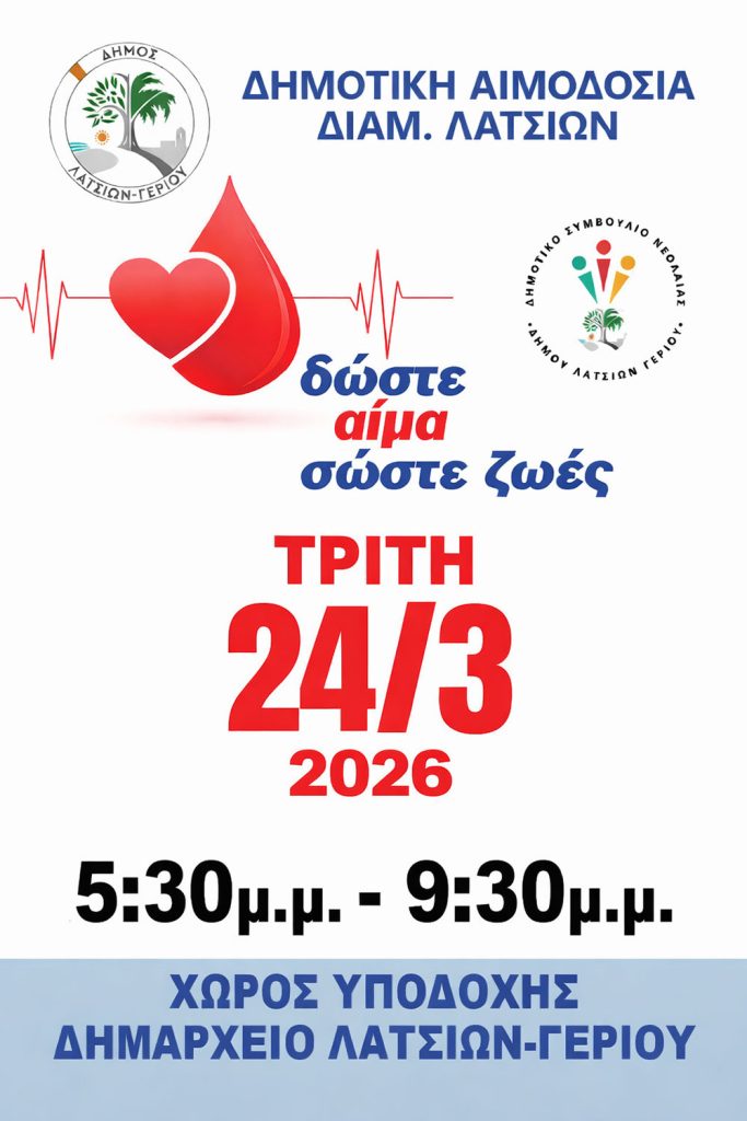24 Μαρτίου 2026 – «Δημοτική Αιμοδοσία Δήμου Λατσιών – Γερίου 24 Μαρτίου 2026»