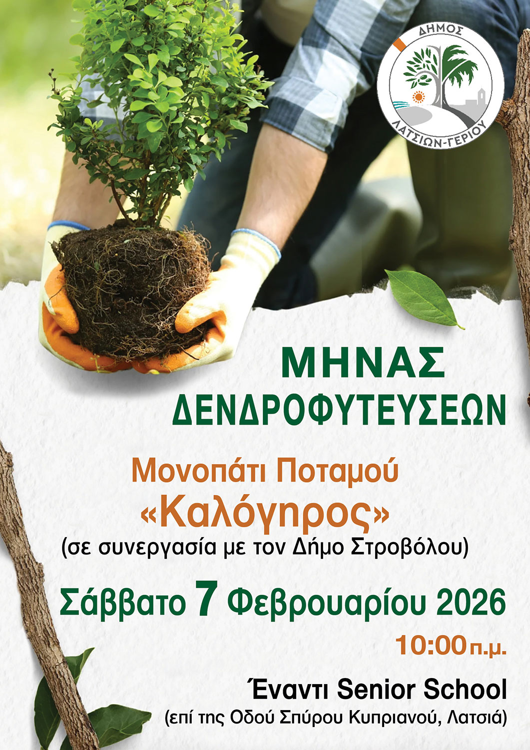 🌱 ΜΗΝΑΣ ΔΕΝΔΡΟΦΥΤΕΥΣΕΩΝ 🌱 Ο Δήμος Λατσιών-Γερίου σας προσκαλεί σε μια όμορφη δράση για το περιβάλλον! 📍 Δενδροφύτευση στο Μονοπάτι Ποταμού «Καλόγηρος», (σε συνεργασία με τον Δήμο Στροβόλου). 🗓 Σάββατο 7 Φεβρουαρίου 2026 ⏰ Ώρα: 10:00 π.μ. 📌 Σημείο συνάντησης: Έναντι Senior School (Οδός Σπύρου Κυπριανού, Λατσιά) Ελάτε να φυτέψουμε μαζί το μέλλον, να φροντίσουμε […]