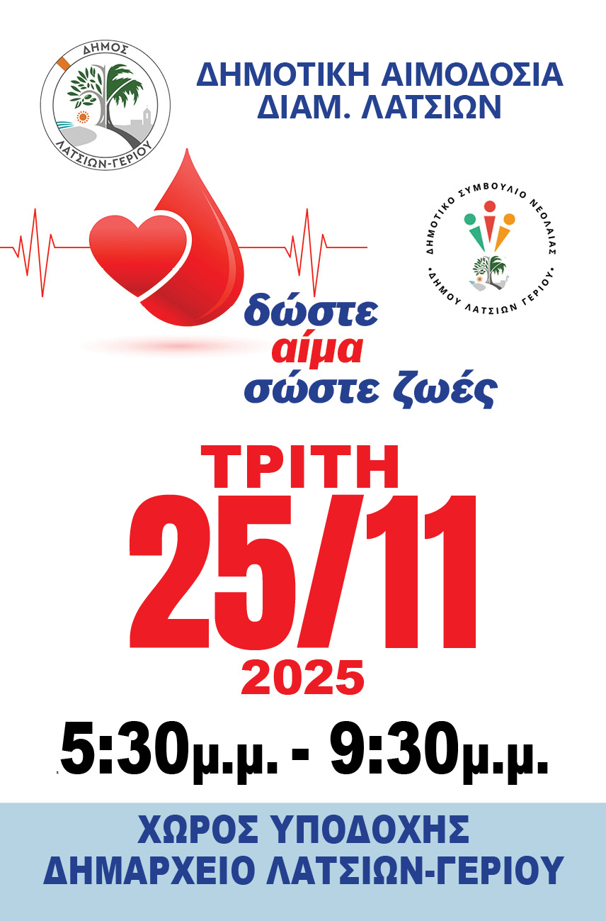 Η Δημοτική Αιμοδοσία Διαμερίσματος Λατσιών, θα πραγματοποιηθεί την Τρίτη 25 Νοεμβρίου 2025, από τις 5:30 μ.μ. έως τις 9:30 μ.μ., στο Δημαρχείο Λατσιών-Γερίου. Το κεντρικό σύνθημα είναι «Δώστε αίμα – […]