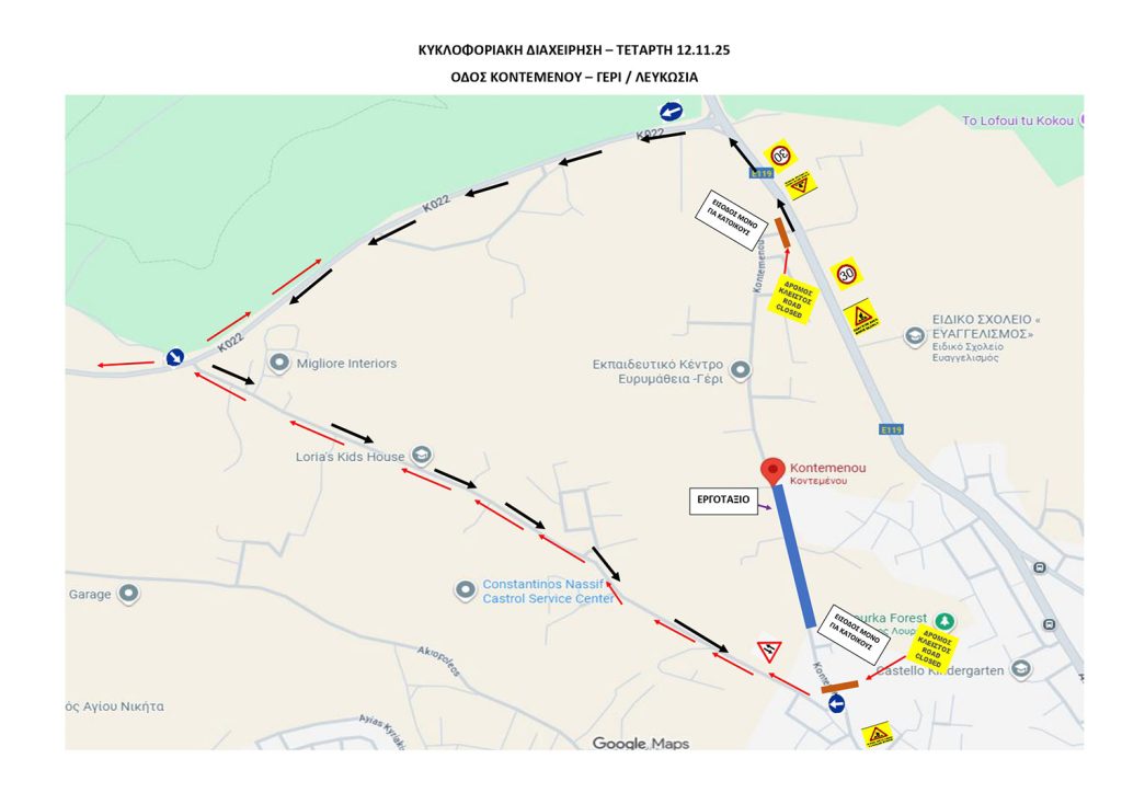 Από Λεωφόρο Αθαλάσσης προς Γέρι μέσω Λεωφόρου Καλαμών / Γλαύκου Κληρίδη και στη συνέχεια οδού Χατζηθεοδοσίου.