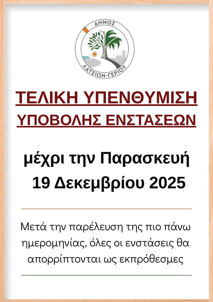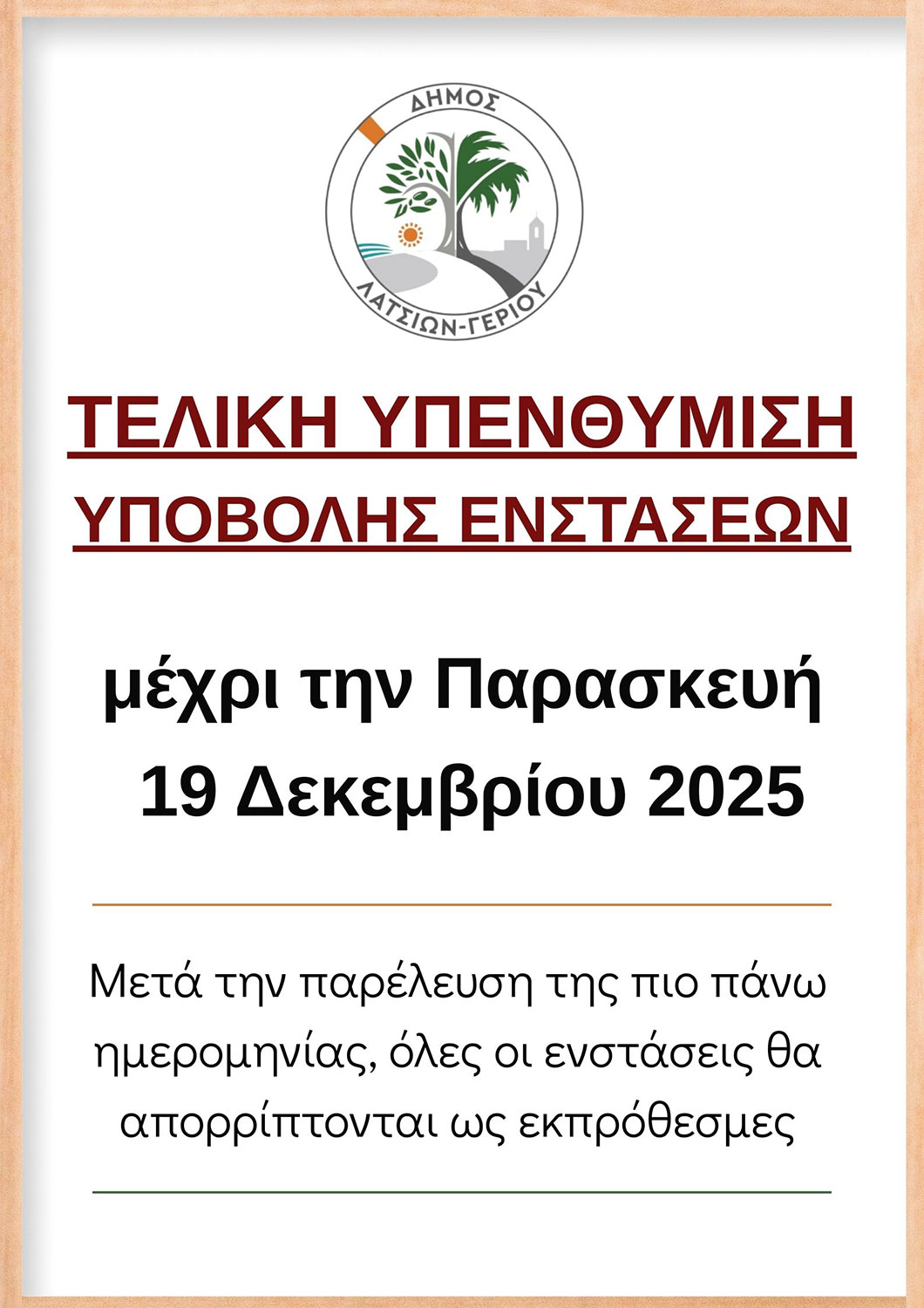 «Τελική υπενθύμιση για υποβολή ενστάσεων 19 Δεκεμβρίου 2025, στο Δήμο Λατσιών-Γερίου» - Δήμος Λατσιών - Γερίου